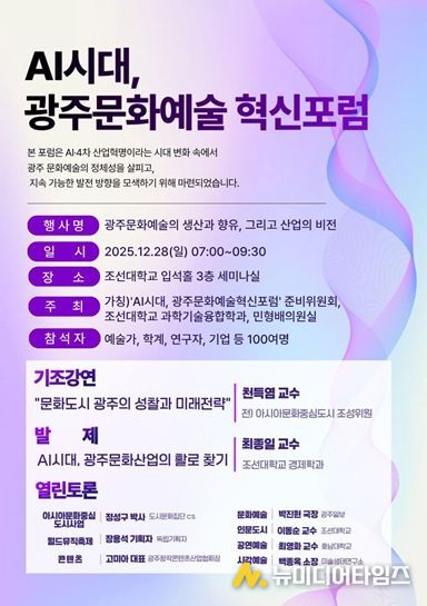 이날 포럼에서는 천득염 전남대 명예교수(전 아시아문화중심도시 조성위원)가 ‘문화도시 광주의 성찰과 미래전략’을 주제로 기조강연에 나선다. 이어 최종일 조선대 경제학과 교수가 ‘AI 시대, 광주문화산업의 활로 찾기’를 주제로 발제한다.