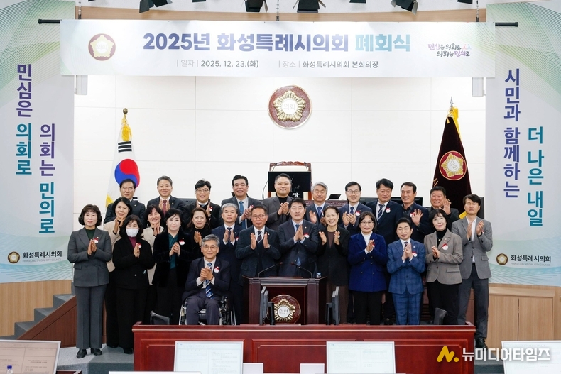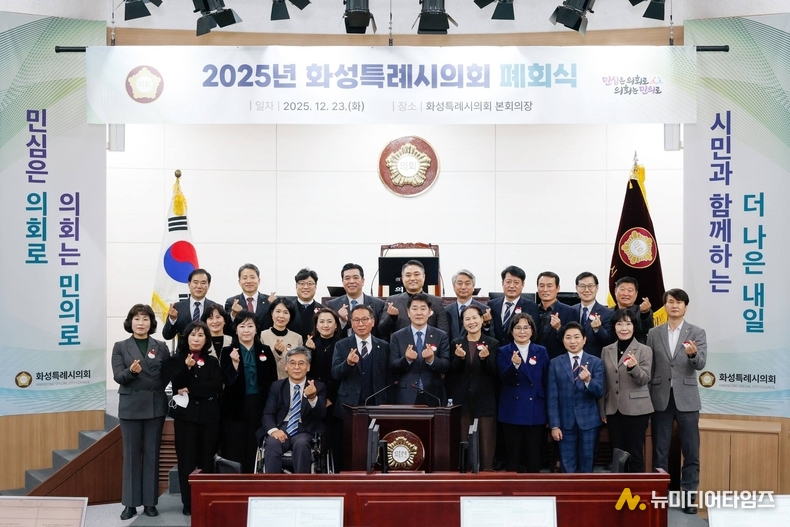 화성특례시의회가 제247회 임시회를 끝으로 2025년 한 해 의정활동의 대단원의 막을 내렸다. 24일 화성특례시의회 의장을 비롯한 의원들과 관계 공무원들이 참석한 가운데 열린 폐회식은 한 해를 마무리하는 뜻깊은 자리였다. 무거운 책임감과 진지함으로 시작된 한 해였지만, 폐회식장에는 서로를 향한 격려와 감사의 마음이 가득했다.