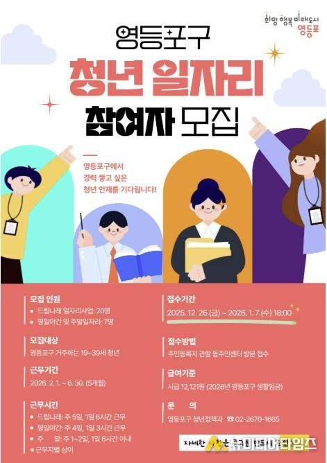 영등포구가 청년들에게 실무 경험과 경제적 자립의 기회를 제공하기 위해 ‘청년 드림나래 일자리’ 및 ‘평일 야간ㆍ주말 공공일자리’ 사업을 함께 운영하고, 오는 12월 26일부터 내년 1월 7일까지 참여자를 모집한다고 밝혔다.