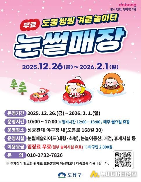 서울 도봉구가 눈썰매장을 12월 26일부터 내년 2월 1일까지 성균관대학교 도봉선수촌 야구장(도봉로168길 30)에서 운영한다.