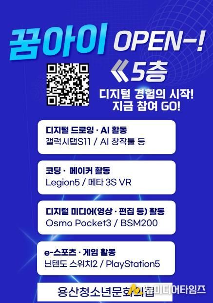 ‘꿈아이 인공지능(AI) 디지털체험실’은 청소년들이 인공지능(AI) 및 디지털 기술을 체험하고 창작 활동을 할 수 있는 참여형 학습 공간이다. 용산꿈나무종합타운 내에 위치하며, 향후 지역 학교 및 청소년 관련 기관들과 협력하여 인공지능(AI)·디지털 교육의 중심지로 활용될 예정이다.