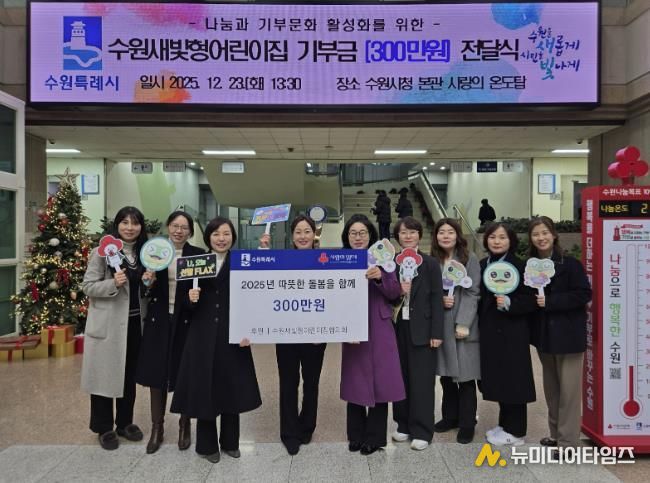 수원새빛형어린이집협의회가 “어려움을 겪는 이웃에게 전달해달라”며 수원시에 300만 원을 기부했다. 전달식은 23일 수원시청 본관 사랑의 온도탑 앞에서 열렸다.