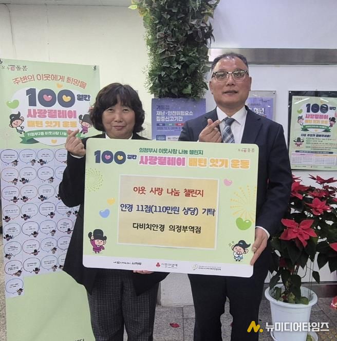 조미경 동장은 “100일간 사랑릴레이에 참여해주신 다비치안경 의정부역점에 진심으로 감사드린다”며 “이번 지원이 취약계층의 시력 개선과 생활 안정에 큰 도움이 될 것으로 기대된다”고 말했다.