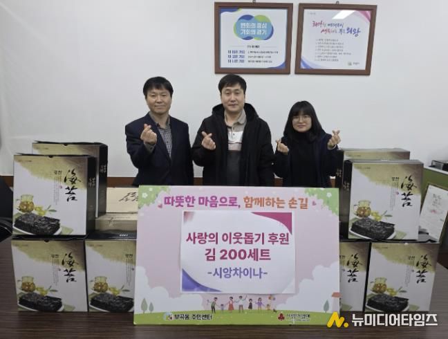 의왕시 부곡동에 위치한 중식당 시앙차이나가 12월 23일 부곡동주민센터를 방문해 관내 취약계층에게 전달해달라며 조미김 200상자를 기탁했다.