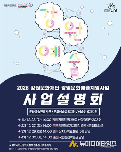 강원문화재단은 2026년 강원문화예술지원사업의 주요 내용과 변경 사항을 도내 예술인에게 종합적으로 안내하기 위해 ‘2026년 강원문화예술지원사업 통합 설명회’를 개최한다고 밝혔다.