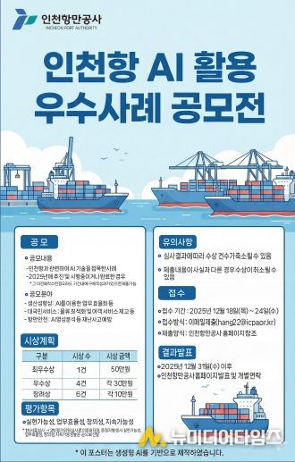 인천항만공사(사장 이경규, 이하 인천항만공사)는'2025년 인천항 혁신을 위한 AI 활용 우수사례 공모전'을 개최한다고 밝혔다.