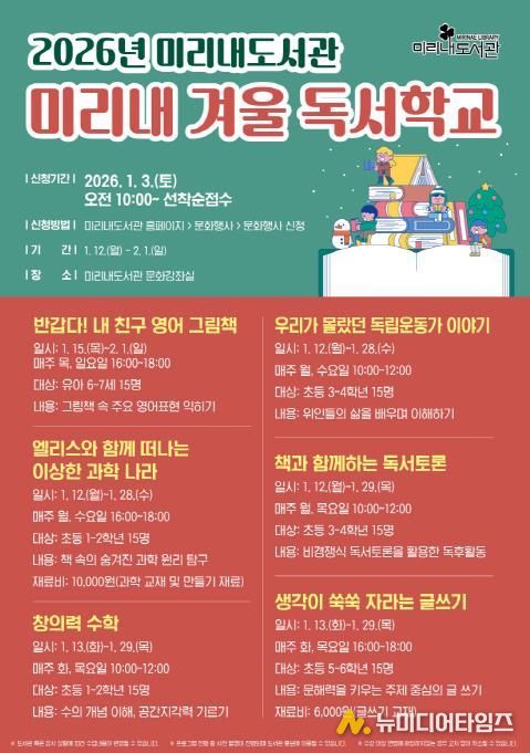원주시 미리내도서관은 오는 1월 유아와 어린이를 대상으로 ‘미리내 겨울 독서학교’를 운영한다.