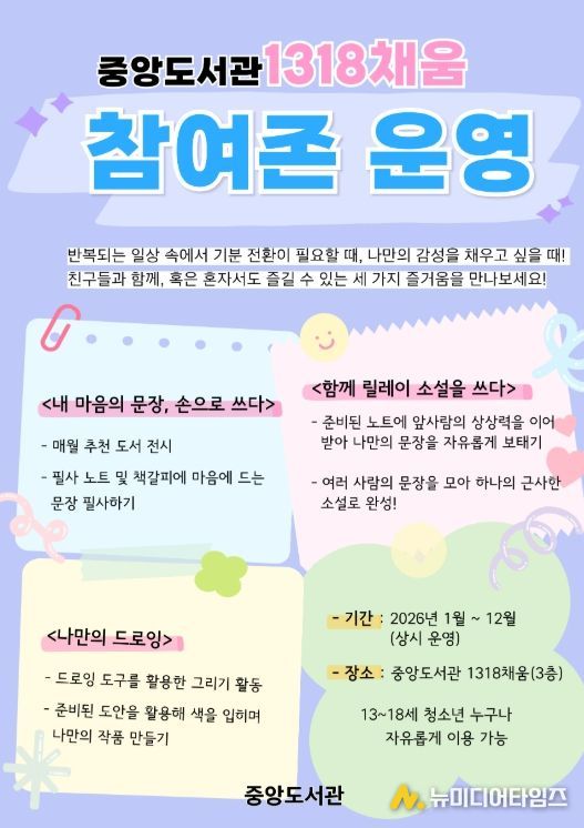 참여존에서는 ▲내 마음의 문장, 손으로 쓰다 ▲함께, 릴레이 소설을 쓰다 ▲나만의 드로잉 코너가 마련돼 청소년들의 자율적인 활동을 지원한다.