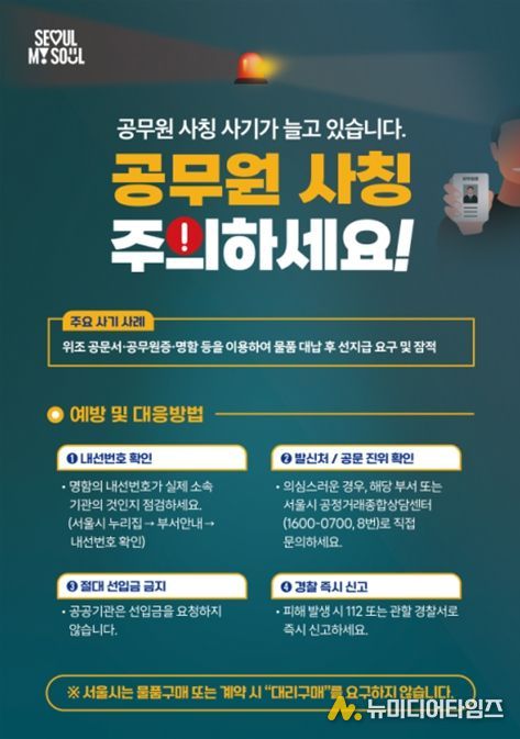 서울시는 최근 중·소상공인을 대상으로 공무원 사칭 사기 피해가 끊이지 않고 발생하고 있어, 서울시공정거래종합상담센터 내 ‘공무원 사칭 사기 피해 신고센터’를 설치하고 적극 대응에 나선다.