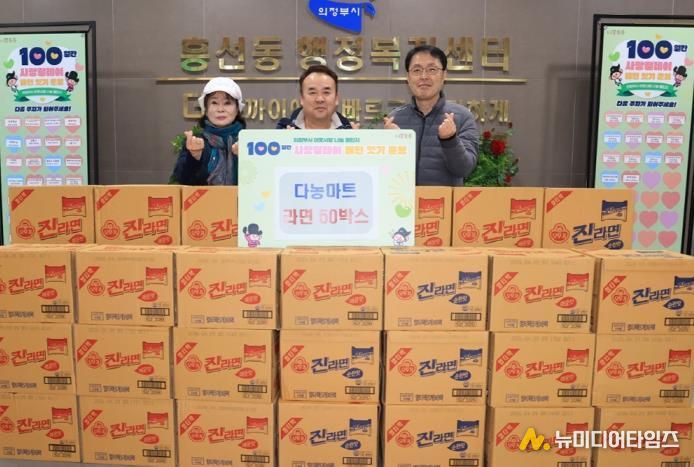 의정부시 흥선동행정복지센터는 12월 24일 다농마트가 ‘100일간 사랑릴레이 배턴 잇기’에 동참해 라면 50상자를 기탁했다고 밝혔다.