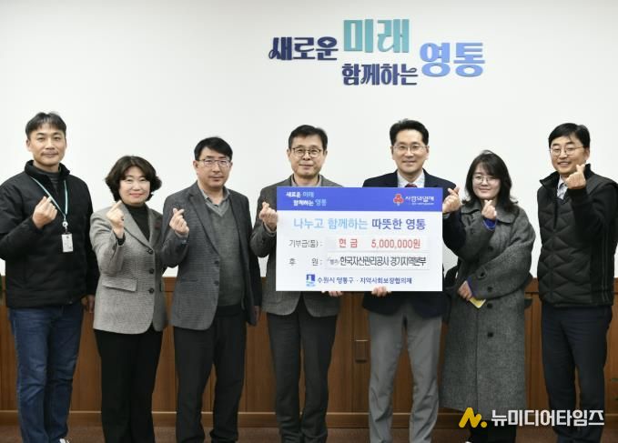 수원시 영통구는 지난 24일 한국자산관리공사 경기지역본부에서 관내 경제적으로 어려움을 겪는 이웃을 위해 성금 500만 원을 기부했다고 밝혔다.