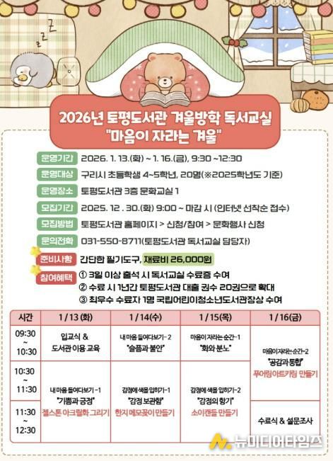 구리시는 오는 2026년 1월 12일부터 1월 16일까지 시립도서관 중 인창·토평·갈매도서관에서 겨울방학을 맞은 초등학생들을 대상으로 다양한 독서 교실 프로그램을 운영한다.