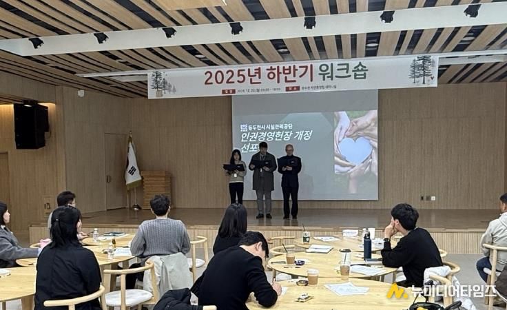 동두천시 시설관리공단은 지난 22일 동두천 자연휴양림 세미나실에서 열린 2025년 하반기 워크숍에서 인권경영 헌장 개정 및 선포식을 개최했다고 밝혔다.