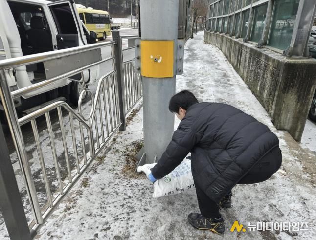 동두천시 생연1동 행정복지센터는 지난 24일, 겨울철 강설과 결빙으로 인한 주민 낙상 사고를 예방하기 위해 관내 상습 결빙 구간에 제설제를 비치했다고 밝혔다.