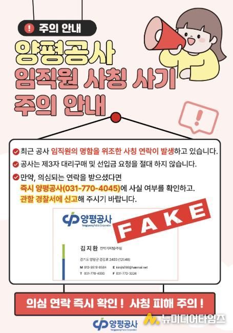 공사는 이번에 배포하는 예방 매뉴얼에 실제 사기 시나리오, 위조 명함 및 문서 예시, 사기 의심 신호, 대응 원칙 등을 상세히 담았다. 특히 보이스피싱 대응 3원칙으로 △긴급 구매 요청 전화를 받으면 일단 의심하기 △반드시 공사 공식 연락처로 재확인하기 △확인 전까지 어떠한 금전 거래도 중단하기를 강조했다. 피해가 발생하거나 의심되는 경우 즉시 경찰(112) 또는 금융감독원(1332)에 신고하고, 양평공사 전략기획팀(031-770-4042)으로도 신고 접수가 가능하다.