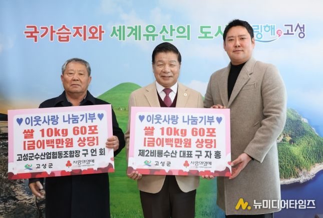 고성군 수산업협동조합 구언회 조합장과 제2비룡수산 대표 구자홍은 12월 26일 고성군을 방문하여 관내 경로당 지원을 위한 이웃사랑 나눔기부 쌀(10kg 120포) 400만 원 상당을 기탁하여 주위에 훈훈함을 선사했다.