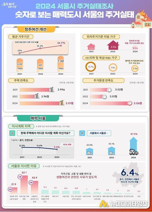 최근 4년간 서울시민의 평균 거주기간이 6.2년에서 7.3년으로 늘어나 주거 안정성이 높아진 것으로 나타났다. 주택 만족도(3.01점)와 주거환경 만족도(3.06점)도 4점만점 기준 모두 상승해, 서울의 전반적인 정주여건이 개선되고 있는 것으로 분석됐다.