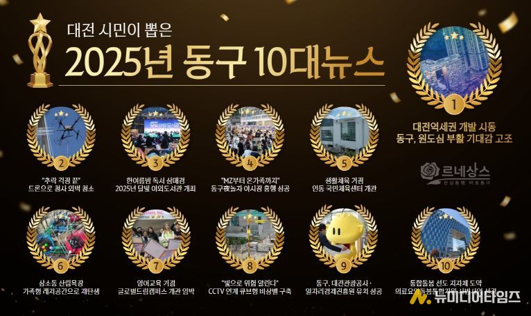 대전 동구는 주민들이 직접 참여하고 동구GPT 분석을 통해 선정한 ‘2025년 동구 10대 뉴스’ 투표 결과, ‘대전역세권 개발 시동’이 압도적인 1위를 차지했다고 29일 밝혔다.