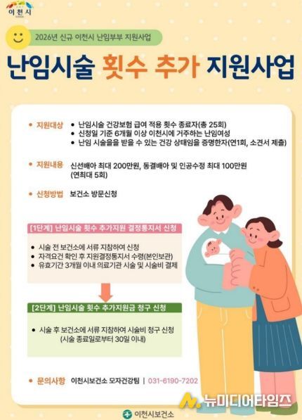 이천시는 난임시술 건강보험 지원 횟수를 모두 소진한 난임 부부에게 심리적·경제적 부담을 완화하고 출산 친화적 환경을 조성하고자 2026년 ‘난임시술 횟수 추가 지원사업’을 새롭게 추진한다.