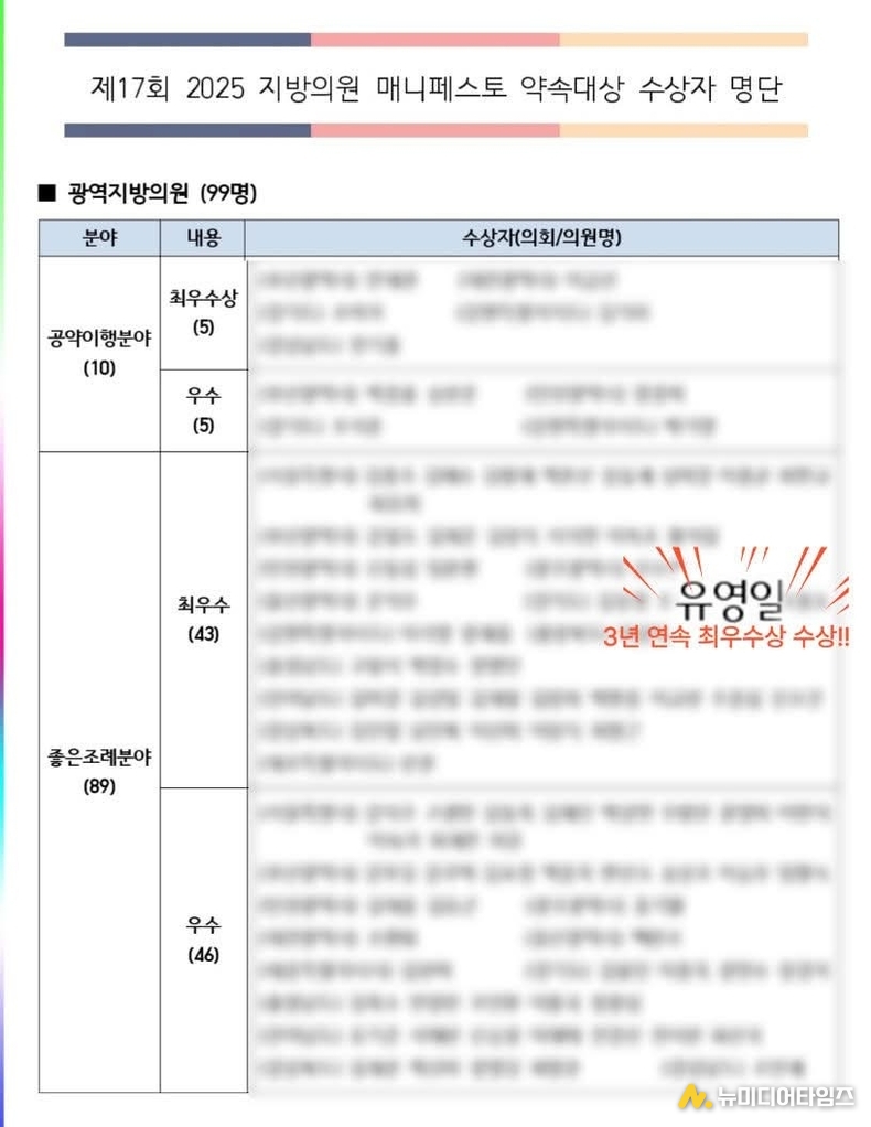 3년 연속 최우수상이라는 기록은 한 정치인의 이력에 덧붙여진 수상 경력이 아니라, 정책이 실제로 작동했는가에 대한 반복된 검증의 결과다. 그래서 유영일 의원의 성과는 과거의 평가에 머물지 않고, 그의 다음 행보가 계속해서 주목받는 이유가 되고 있다.