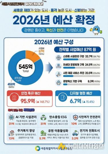 세종특별자치시시설관리공단은 이사회 의결을 거쳐 2026년도 본예산을 545억원으로 최종 확정했다고 29일 밝혔다.