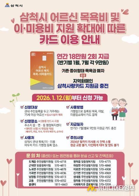 삼척시는 어르신들의 위생 관리와 건강 증진을 위해 기존 목욕비 지원사업을 확대하고, 2026년부터 이미용비까지 포함한 통합 지원사업을 시행한다고 밝혔다.