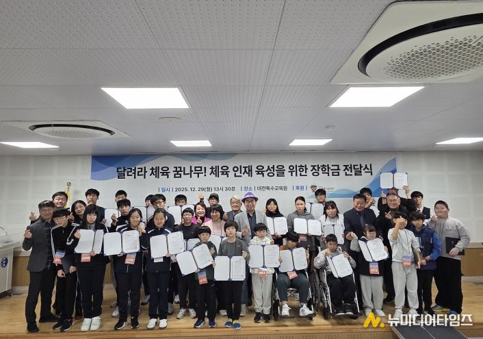 대전특수교육원은 12월 29일 본원과 한밭수목원 엑스포시민광장에서 장애학생 육상 종목 특기생과 미래 육상 꿈나무 63명을 대상으로 (재)조웅래나눔재단(이사장 조웅래)으로부터‘체육(육상) 종목 미래인재 장학금 전달식 및 달리기 행사’를 개최하고, 장학증서를 수여했다