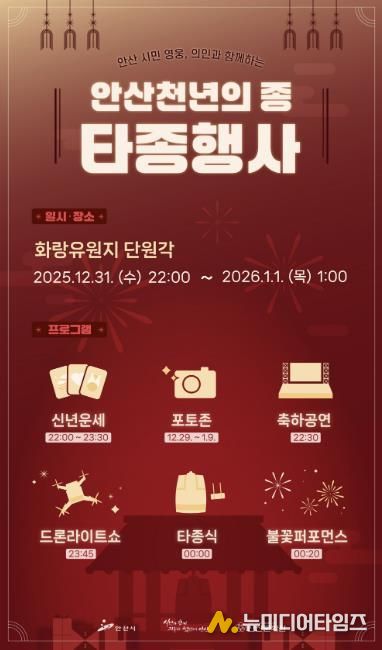 안산시는 오는 31일 오후 10시부터 화랑유원지 단원각에서 ‘2026 안산 천년의 종 타종 행사’를 개최한다고 30일 밝혔다.
