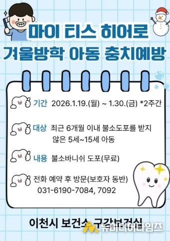 이천시 보건소는 “겨울방학 기간을 활용한 이번 불소 바니쉬 도포 사업을 통해 아동의 충치 예방 효과를 높이고, 조기 관리로 치과 치료비 부담을 줄일 수 있을 것으로 기대한다”며 “많은 보호자와 아동의 적극적인 참여를 바란다”라고 밝혔다.
