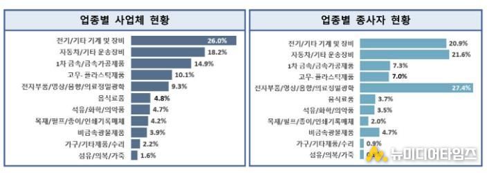 조사 결과, 아산시 제조업은 ‘전기/기타 기계 및 장비업’이 26.0%로 가장 높은 비중을 차지했다. 종사자 기준으로는 ‘전자부품/영상/음향/의료정밀광학업’이 27.4%로 가장 많았다.