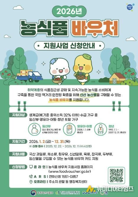 시흥시는 저소득층의 국내 신선 농식품 접근성을 높이고, 국산 농산물 소비를 촉진하기 위해 ‘2026년 농식품 바우처 지원사업’을 추진한다.