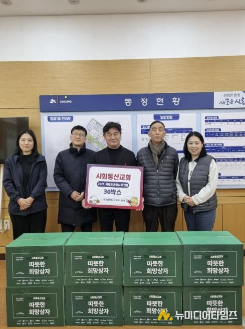 시흥시 정왕1동 행정복지센터에 지난 12월 30일 시화동산교회가 방문해 관내 어려운 이웃을 돕기 위해 ‘희망상자’ 30개를 전달했다.