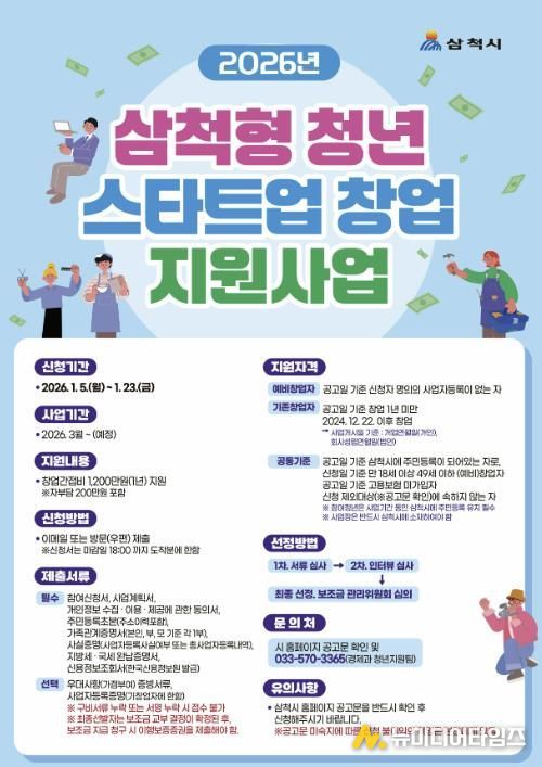 삼척시가 혁신적인 창업 아이디어를 보유한 청년들의 창업 도전을 지원하기 위해 '2026년 삼척형 청년 스타트업 창업 지원사업' 참여자를 모집한다고 밝혔다.