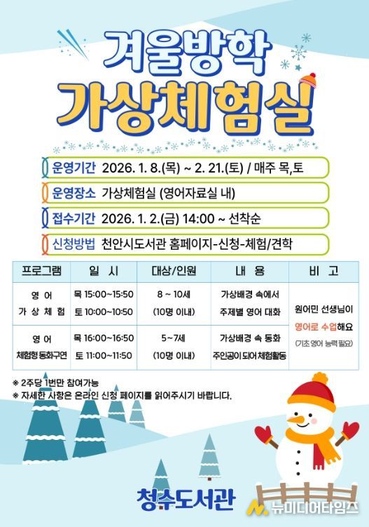 사전 신청은 영어 가상체험실은 내년 1월 2일부터, 잉글리시 스토리텔링은 1월 6일부터 가능하며, 자세한 내용은 천안시도서관 누리집에서 확인할 수 있다.