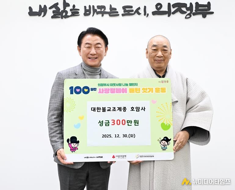 김동근 시장은 “연말을 맞아 지역의 어려운 이웃을 위해 따뜻한 나눔을 실천해 주신 호암사 신도분들에게 진심으로 감사드린다”며 “이번 성금은 우리 사회가 함께 살아가고 있다는 희망의 메시지로, 도움이 필요한 이웃들에게 큰 용기와 위로가 될 것”이라고 말했다.
