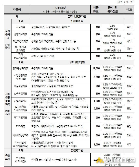 자금 유형별로는 ▴중소기업육성기금 재원으로 융자해 주는 ‘직접 융자금(고정금리)’ 1,800억 원 ▴시중은행 재원으로 자금을 융자, 대출금리 이자 일부를 서울시가 보전하는 ‘시중은행 협력자금(변동금리, 이자차액보전)’ 2조 200억 원 ▴마이너스통장 방식의 ‘안심통장(특별보증)’ 2,000억 원을 각각 공급한다.