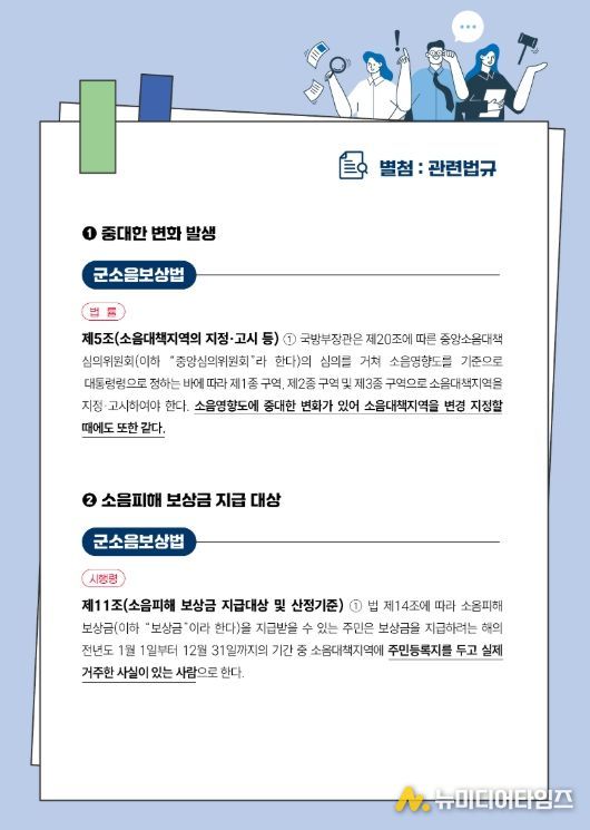 그간 군 소음 대책 지역 내 거주하는 경우 개인별 월 최대 제1종 구역 6만 원, 제2종 구역 4만 5천 원, 제3종 구역 3만 원을 보상했으나, 이번 지급기준 변경으로 기존 1종 구역은 3종 구역 수준으로 보상하고, 2·3종 구역에 해당하는 경우에는 보상에서 제외된다.