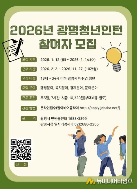 박승원 광명시장은 “이번 청년 일자리사업은 청년들이 안정적인 환경에서 실질적인 직무 경험을 쌓고, 향후 취업으로 이어질 수 있도록 돕기 위한 것”이라며 “광명시 청년들의 많은 관심과 적극적인 참여를 바란다”고 밝혔다.