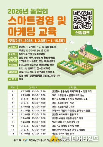 이천시농업기술센터는 농업인의 디지털 경쟁력 강화와 경영 안정, 판로 확대를 위해 ‘2026년 농업인 스마트경영 및 마케팅 교육’의 교육생을 오는 1월 15일까지 모집한다고 밝혔다.