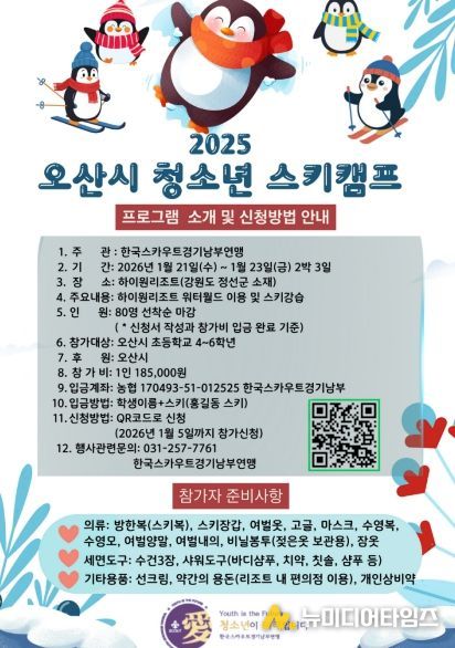 이권재 오산시장은 “이번 겨울 스키캠프는 청소년들이 자연 속에서 다양한 체험활동을 통해 협동심과 도전정신을 기를 수 있는 소중한 기회가 될 것”이라며, “앞으로도 청소년의 건강한 성장과 건전한 여가활동을 지원하는 체험형 프로그램을 지속적으로 확대해 나가겠다”고 말했다.