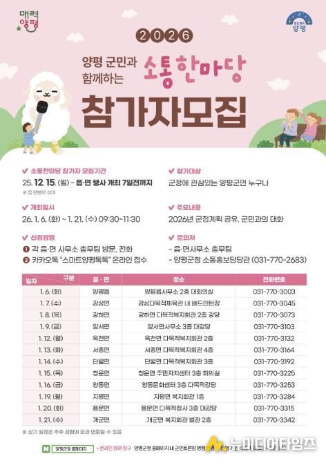 한편, ‘2026년 군민과 함께하는 소통한마당’은 △6일 양평읍 △7일 강상면 △8일 강하면 △9일 양서면 △12일 옥천면 △13일 서종면 △14일 단월면 △15일 청운면 △16일 양동면 △19일 지평면 △20일 용문면 △21일 개군면 순으로 개최된다.