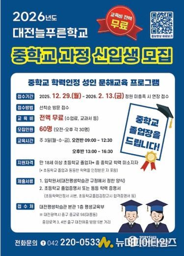 대전평생학습관은 2026년 2월 13일까지 2026년 대전늘푸른학교 중학교 학력인정 과정 신입생을 모집한다고 밝혔다.