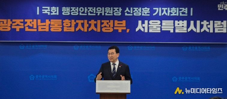 신정훈 국회 행정안전위원장은 오늘 광주광역시의회에서 기자회견을 열고 “광주·전남 대통합을 통해 분권형 국가로의 대전환을 이루고, 대한민국 재도약의 길을 열겠다”고 밝혔다.