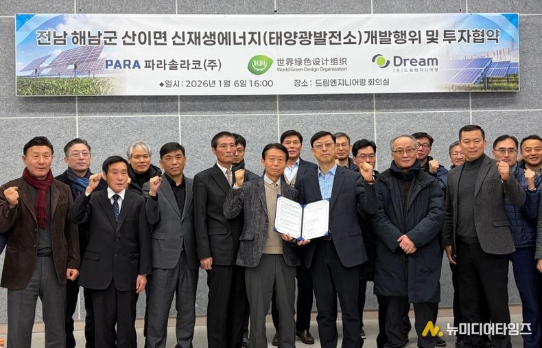 파라솔라코(주)(대표 고창열)와 (주)드림엔지니어링(대표 오진택)은 2026년 1월 6일 오후 4시, 드림엔지니어링 본사 회의실에서 ‘해남군 산이면 태양광발전소 개발허가 및 솔라시도 타운 조성 협약식’을 개최했다고 밝혔다.