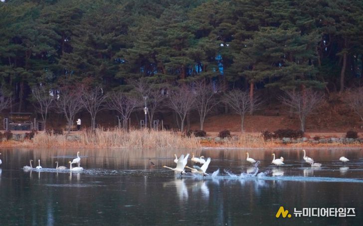 맑게 갠 하늘 아래 울진군 연호공원에서 겨울 철새 고니가 힘차게 날아오르고 있다.