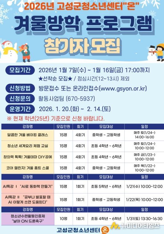 고성군청소년센터“온”은 겨울방학을 맞이한 관내 청소년들을 대상으로 2026년 1월 20일부터 2월 14일까지 2026년 겨울방학 프로그램 및 특강을 운영한다.