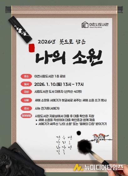 이천시립도서관은 2026년 병오년 새해를 맞아 시민의 한 해 소망과 다짐을 서예가가 붓글씨로 써주는 '2026년 붓으로 담은 ‘나의 소원’' 행사를 오는 1월 10일 오후 1시부터 5시까지 시립도서관 1층 책마당 로비에서 운영한다.