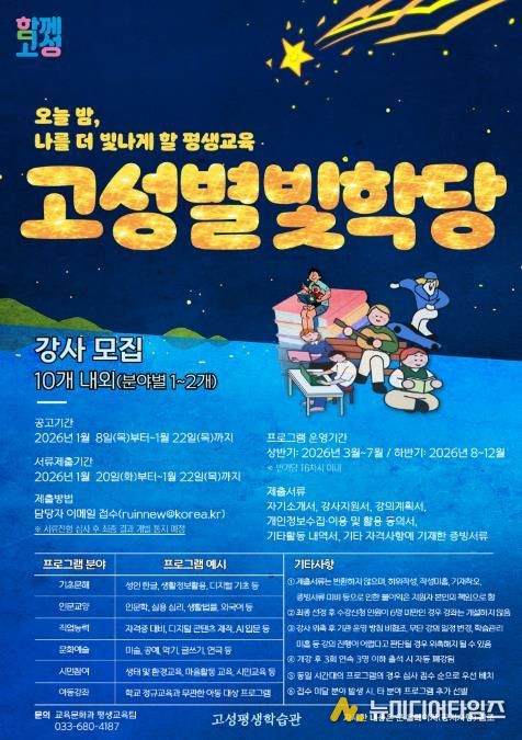 평화 경제 거점 도시 강원 고성군은 군민의 평생학습 기회 확대와 야간 학습 활성화를 위해 2026년 고성평생학습관 정규 프로그램인 ‘고성별빛학당’ 강사를 모집한다고 밝혔다.
