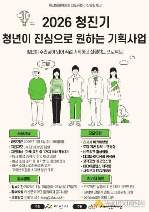 (재)아산문화재단 유성녀 대표이사는 “청년이 지역의 자원과 이슈를 바탕으로 마음껏 실험하고 성장할 수 있도록 구조를 바꾼 사업”이라며 “지역에서 새로운 시도를 고민하는 청년 예술인과 기획자들의 적극적인 참여를 기대한다”고 밝혔다.