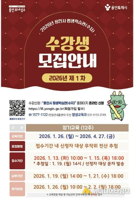 접수는 용인시 평생학습관 홈페이지에서 온라인으로 신청(모바일 가능)하면 된다.
